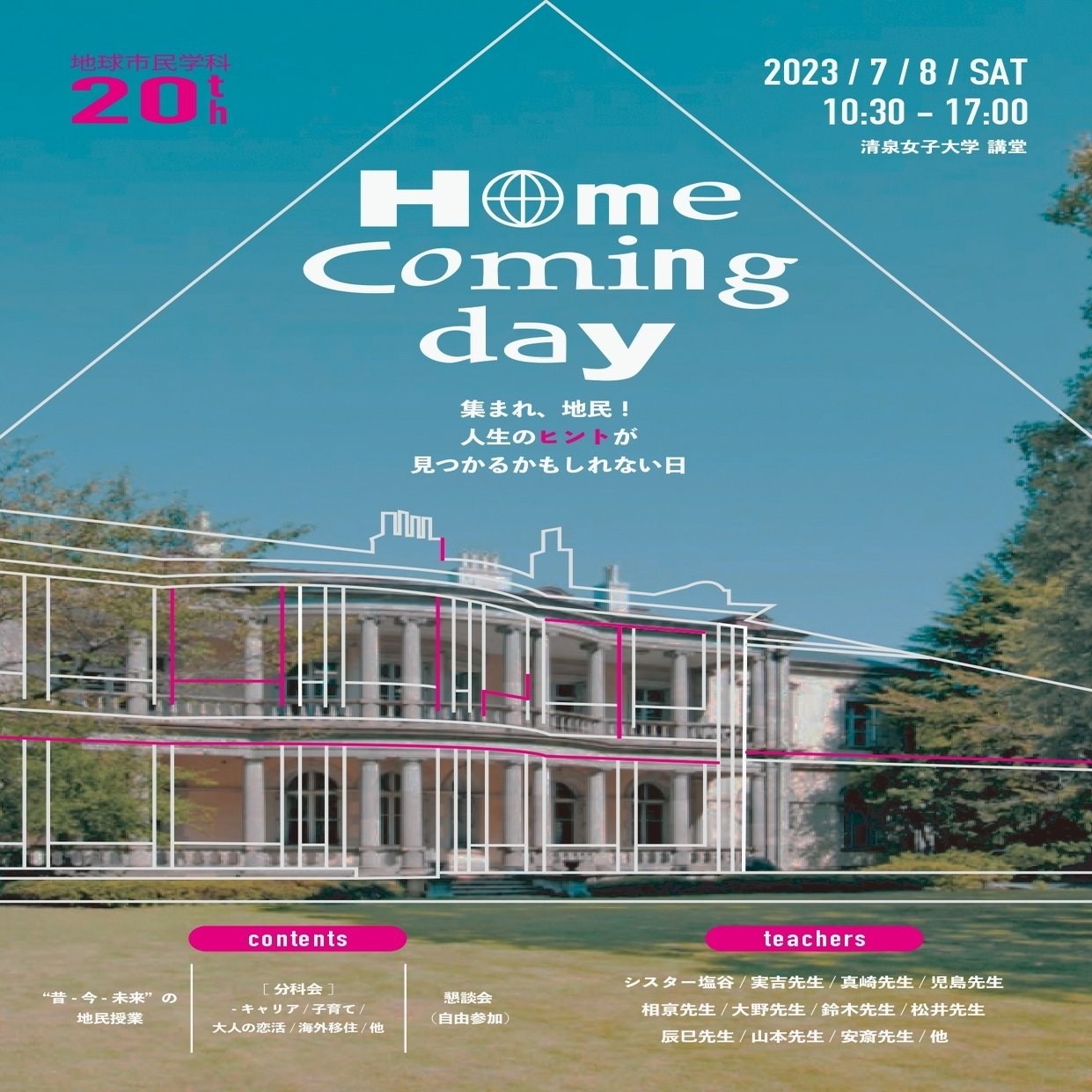 2023年7月8日、地球市民学科の20周年記念イベント「Home Coming Day:集まれ!地民 人生のヒントが見つかるかもしれない日」を開催し、地球市民学科1期生から19期生まで約200名の卒業生が集まりました。